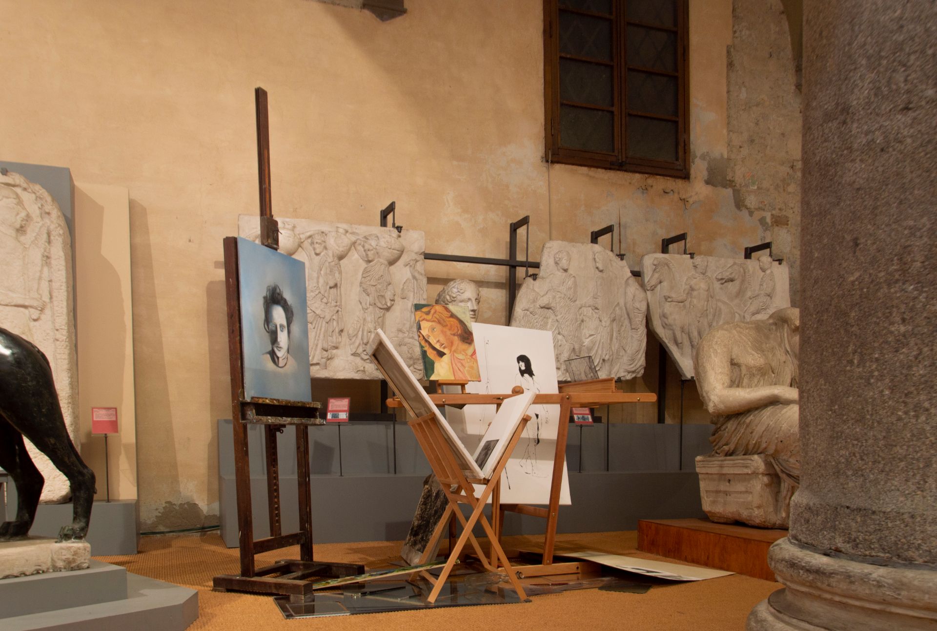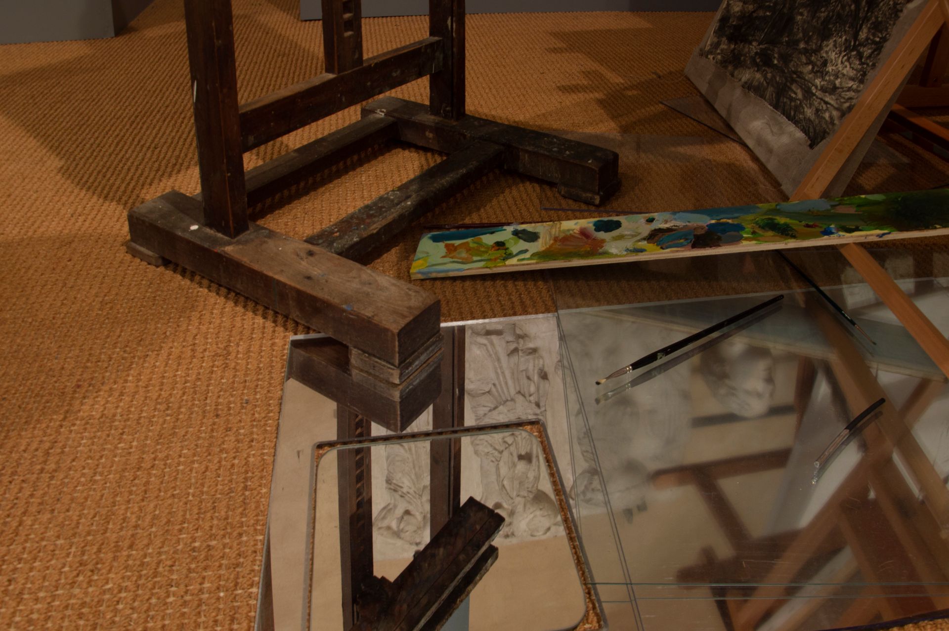I materiali in una bottega sono molteplici: matita, carboncino, fusagine, sanguinia, gessi, pennelli, inchiostri, colori, questo perché le tecniche sono varie ma tutte valide ad elaborare un pensiero, una idea, una visione e solo quando il lavoro sarà riuscito ad evocare una sensazione nel fruitore allora l’artista avrà raggiunto la sua mission.